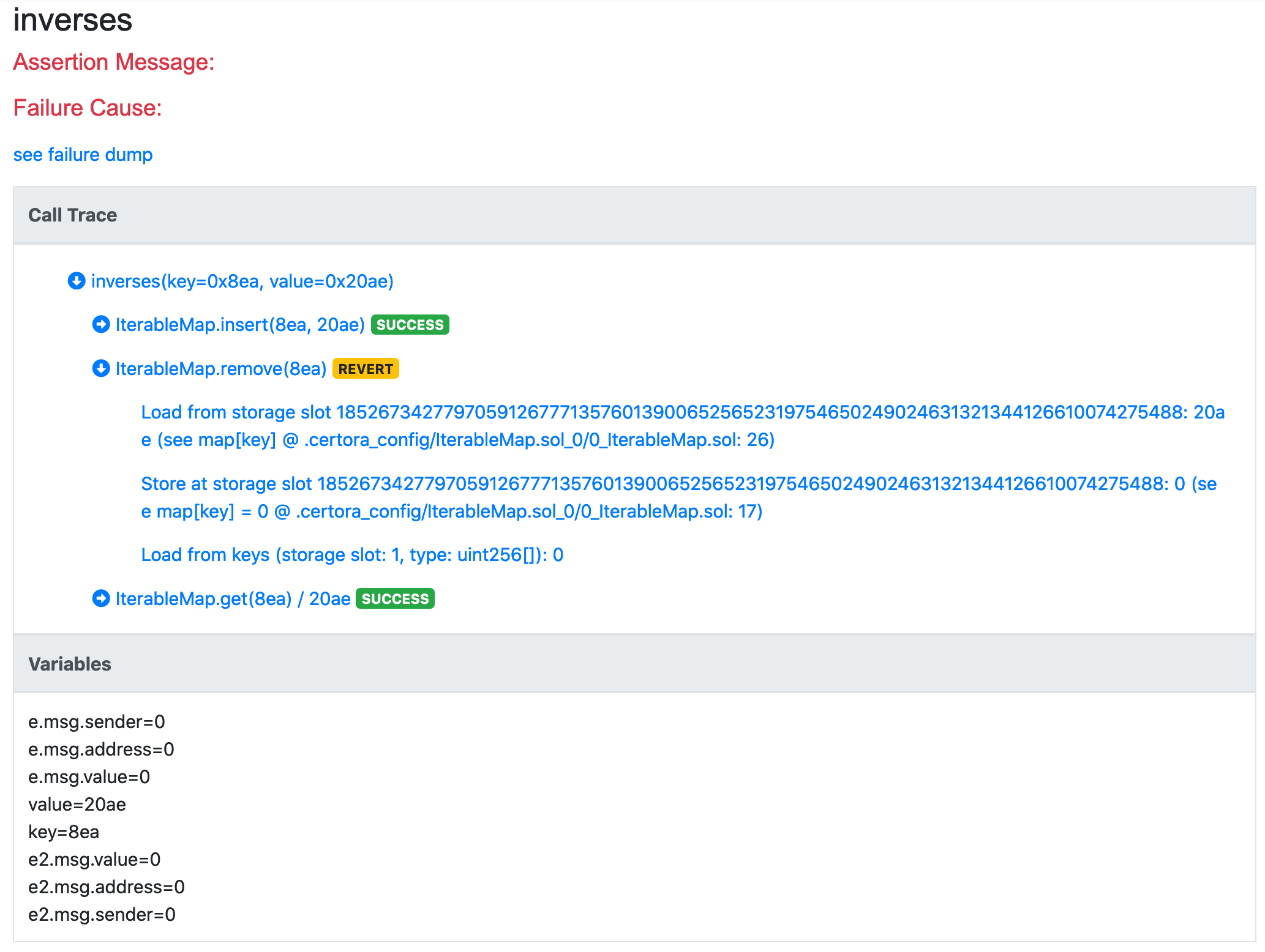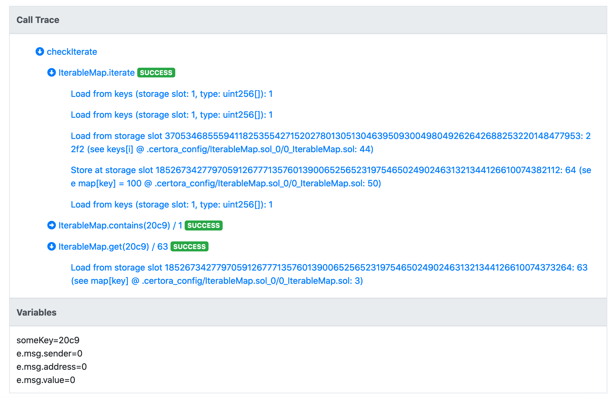 Let’s unpack what can be seen here. First, the length of the keys array is 1, and we read a key 22f2. We then write 100 to it in the map and then iterate function is done. We then note that someKey, the key we want to check for, is not 22f2, but rather 20c9. While we assumed that it is contained in the map by using the contains function, it is not contained in the keys array. This is expected since the Prover’s starting state can be completely arbitrary, subject to constraints that we specify on it. We wish to leave the contains function to be an O(1) complexity function, and rather provide the tool with the invariants that will allow it to see only states that “make sense”, or in more precise terms, we only want to see states where the keys array contains exactly the same elements as the non-zero valued keys in the map.