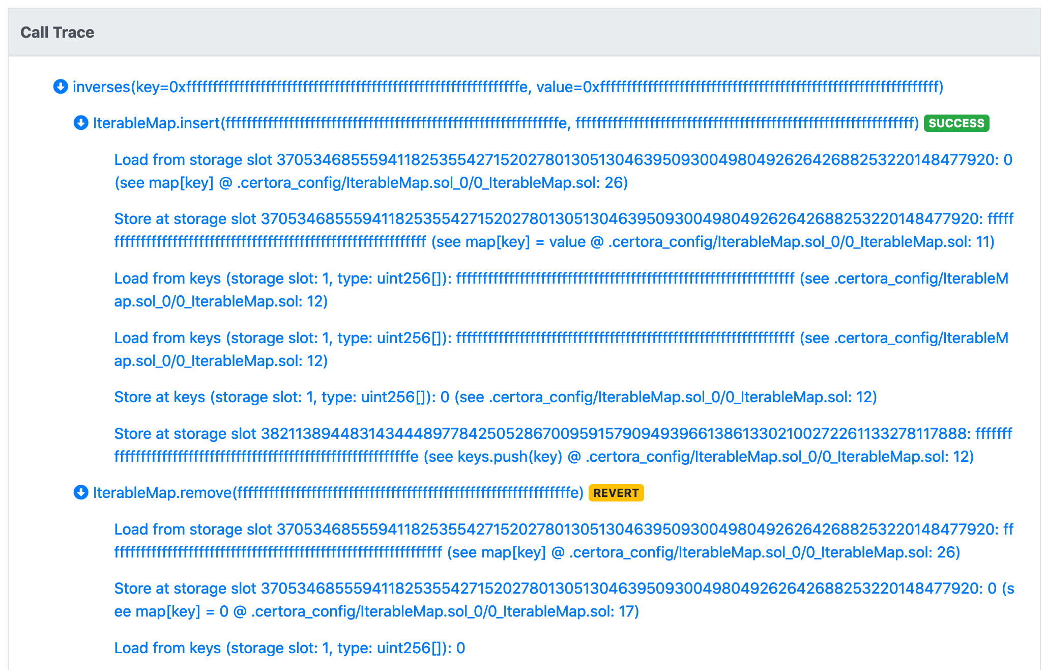 It is still reported that the length of keys is 0, but this is unexpected. We examine the operations performed by insert, and we see that it loaded a length of ff....ff, and then stored a length of 0. That is, our array filled-up and reached the length of max uint256. This may look absurd or unrealistic, but that’s where the power of the Prover lies - it doesn’t miss any edge case. If we believe it is unrealistic for the length of keys to reach the maximum value, we should: