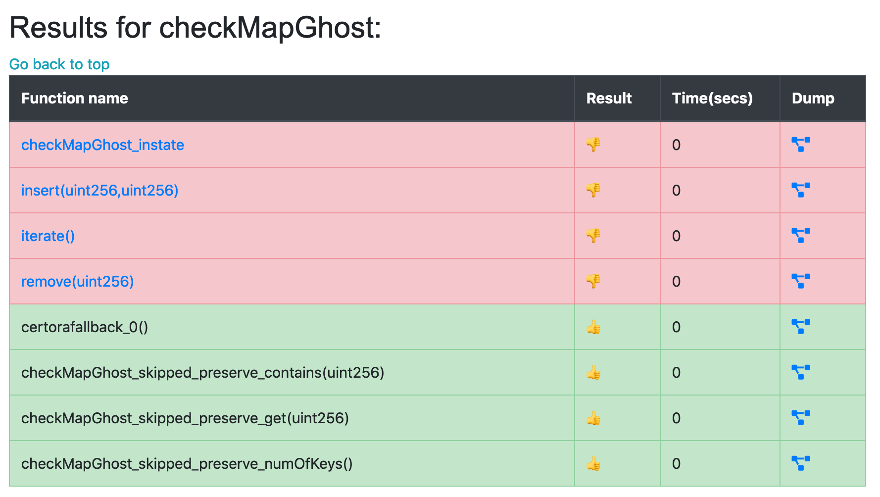 Currently, the rule fails for all state-mutating functions, and even in the contract’s initial state after constructor (rule checkMapGhost_instate):