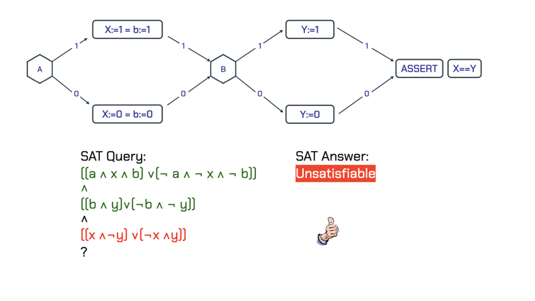 Notice how this formula compactly defines 4 paths of the program. The SAT solver identifies that for a = 0 and b = 1, the values of x and y are 0 and 1 respectively, which shows a violation of the assertion.